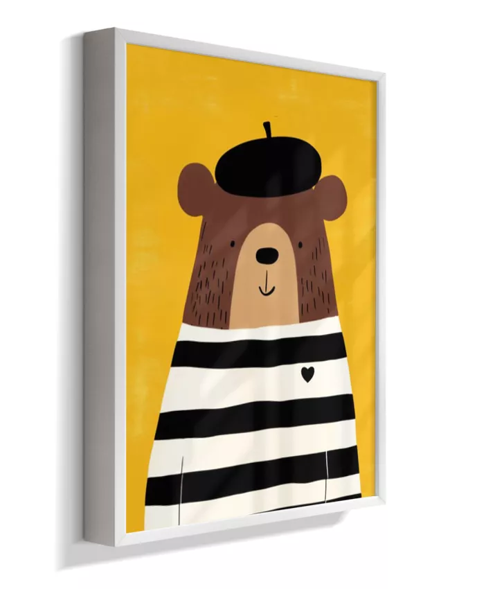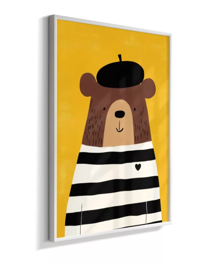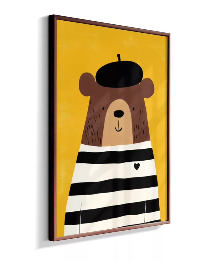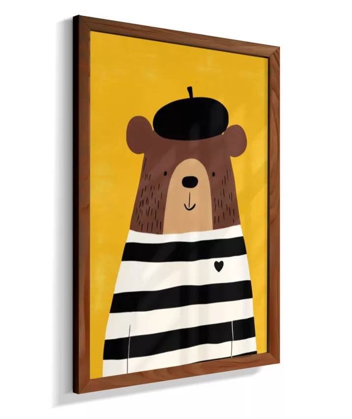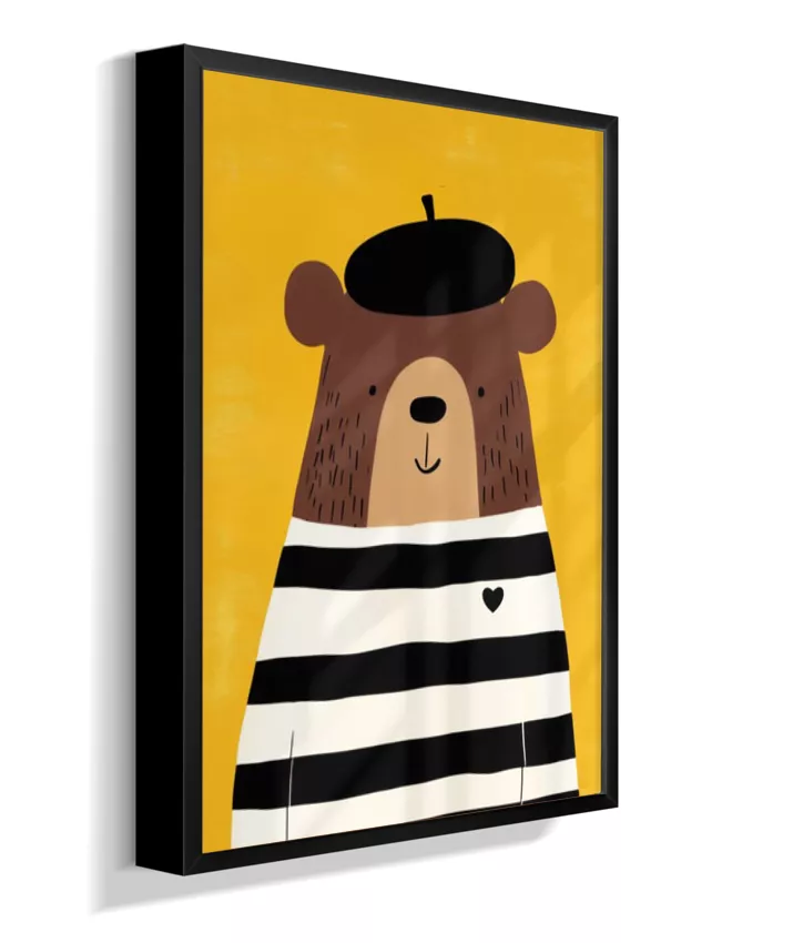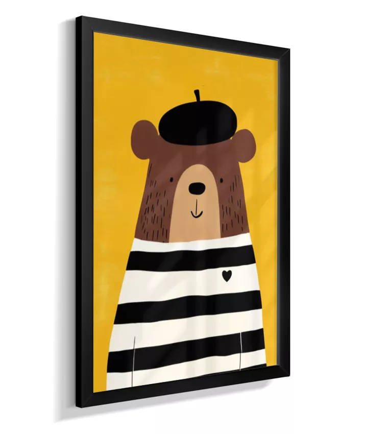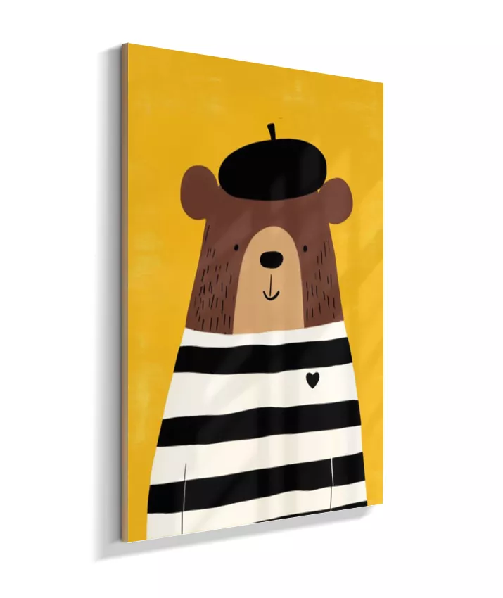 Urso com casaco listrado p/b e boina (fundo amarelo pintado)