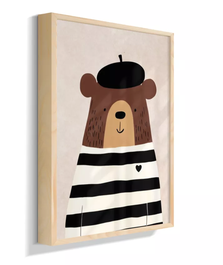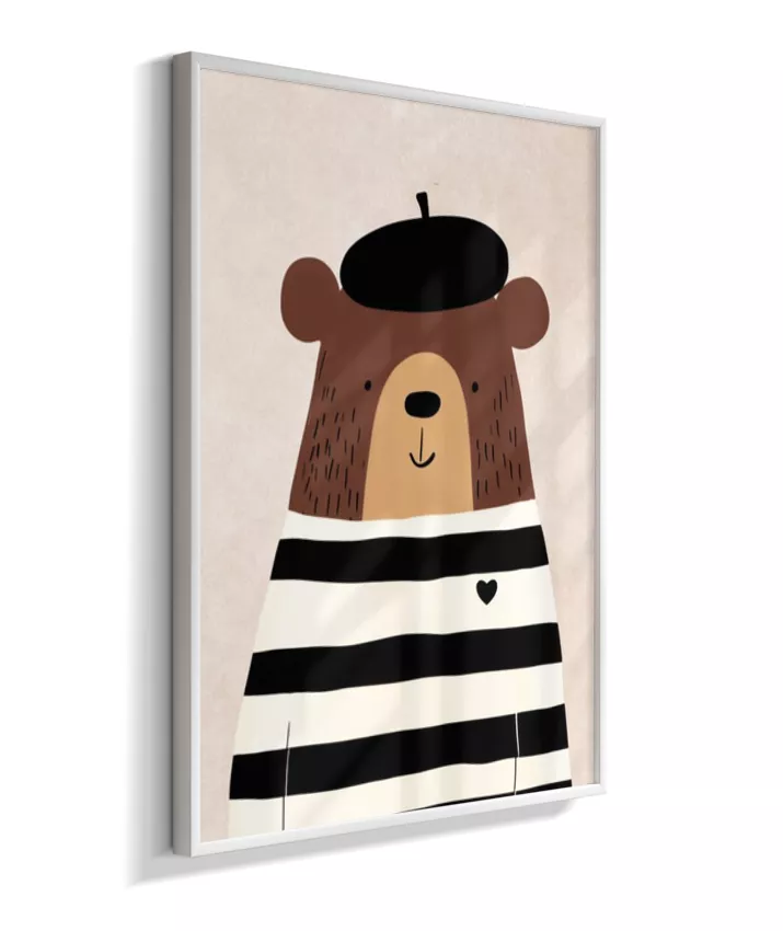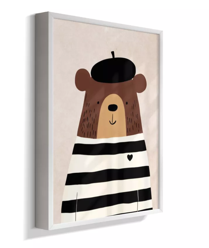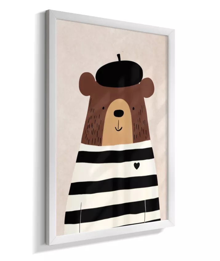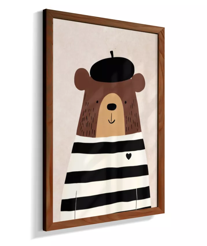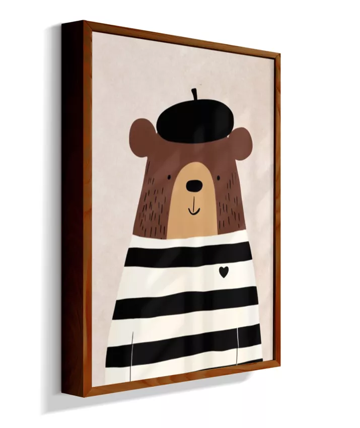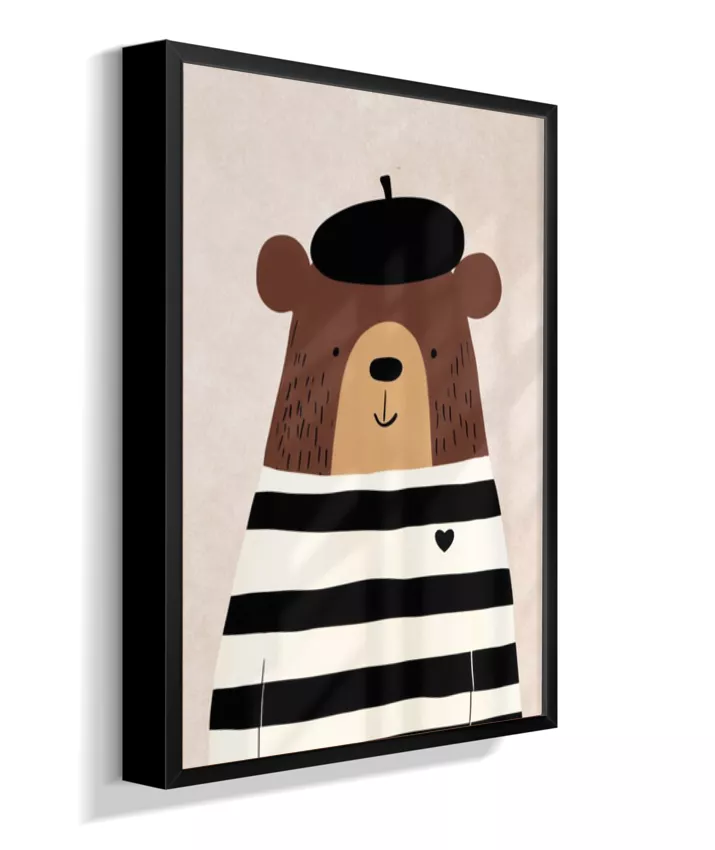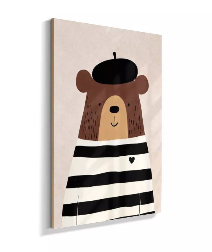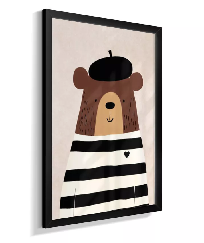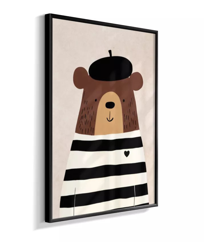 Urso com casaco listrado p/b e boina (fundo neutro com textura)